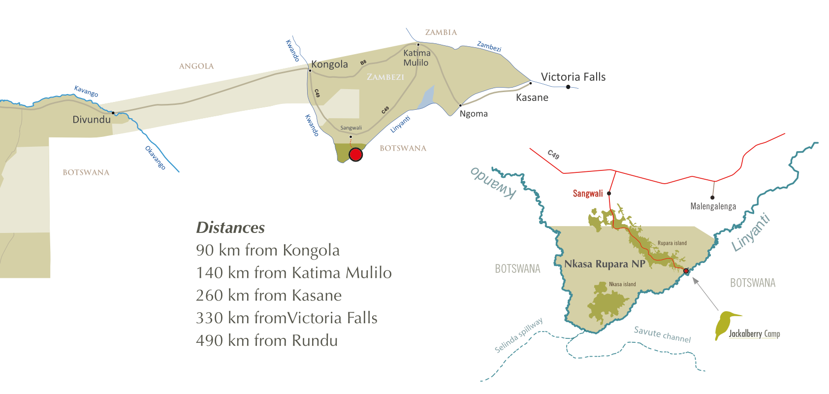 Jackalberry tented Camp is situated in a exclusive concession inside the Nkasa Rupara NP (Mamili) situated 150km west of Katima Mulilo in the Zambezi Region (Caprivi) of Northen Namibia.